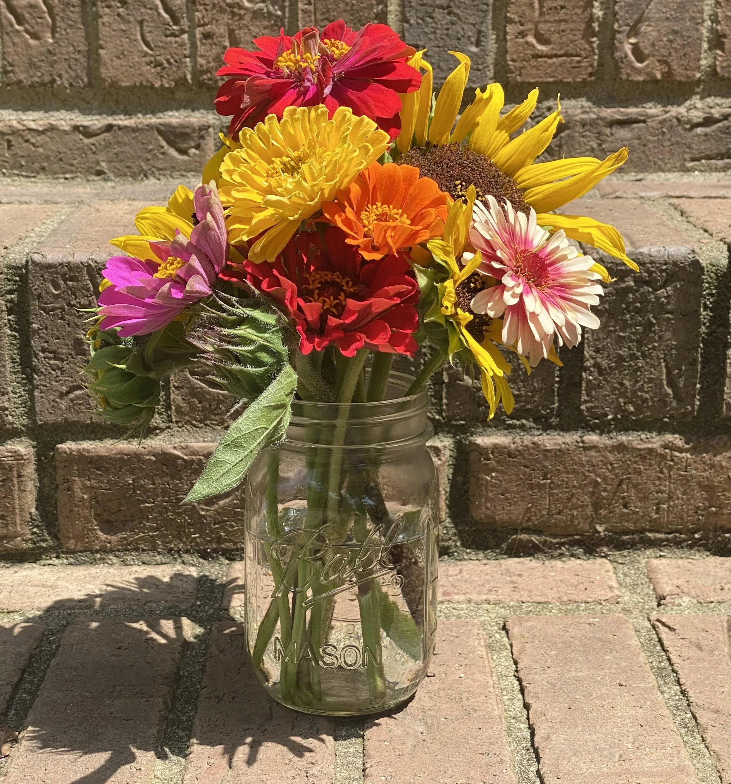 Mason Jar Bouquet - $15 each for 8 - 10 stems of sunflowers and zinnias.